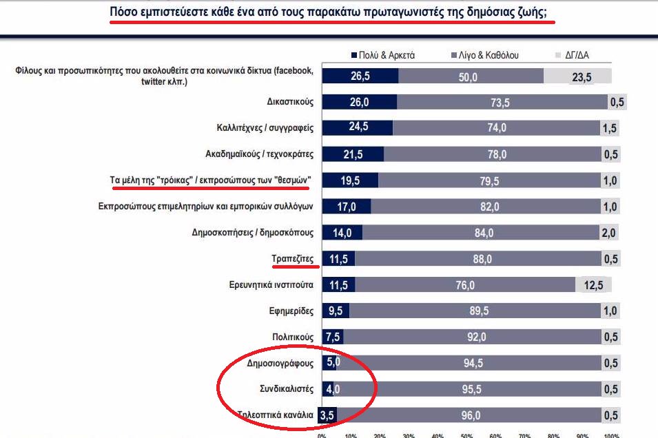 Ευτυχώς είναι και οι συνδικαλιστές αλλιώς τα τηλεοπτικά κανάλια και οι δημοσιογράφοι θα μοιράζονταν μόνοι τον πάτο του πίνακα εμπιστοσύνης