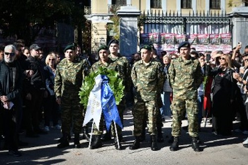 Κάτω από έντονο χειροκρότημα και συνθήματα όπως «Οι φαντάροι είναι του λαού παιδιά, έξω από τα σύνορα δεν έχουνε δουλειά» και «Η Ιστορία έχει μια σωστή πλευρά, με την Παλαιστίνη ως τη λευτεριά»,νέοι στρατευμένοι, με τον ιδιαίτερο συμβολισμό τους, κατέθεσαν στεφάνι στο μνημείο του ξεσηκωμού του Πολυτεχνείου, ενώ ετοιμάζουν και την παρουσία τους στη σημερινή αντιιμπεριαλιστική πορεία.