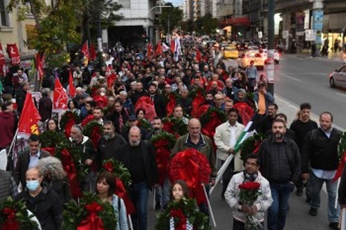 Αργότερα, το απόγευμα, στεφάνια στον χώρο του Πολυτεχνείου κατέθεσαν δεκάδες συνδικάτα και μαζικοί φορείς που ανταποκρινόμενα στο κάλεσμα του ΠΑΜΕ πραγματοποίησαν συγκέντρωση στην πλατεία Κάνιγγος και από εκεί με πορεία, στην κεφαλή της οποίας μπήκαν τα στεφάνια, έφτασαν συγκροτημένα στο Πολυτεχνείο τιμώντας την 50ή επέτειο της εξέγερσης. Eπικαιροποιώντας το αγωνιστικό μήνυμά του, κατήγγειλαν τους ιμπεριαλιστικούς σχεδιασμούς και επεμβάσεις, απαίτησαν καμία συμμετοχή της χώρας «στου ΝΑΤΟ τα σφαγεία», εξέφρασαν την αλληλεγγύη στον Παλαιστινιακό λαό, βροντοφώναξαν «Του Πολυτεχνείου ο αγώνας ζει - Μας δείχνει τον δρόμο για την ανατροπή».