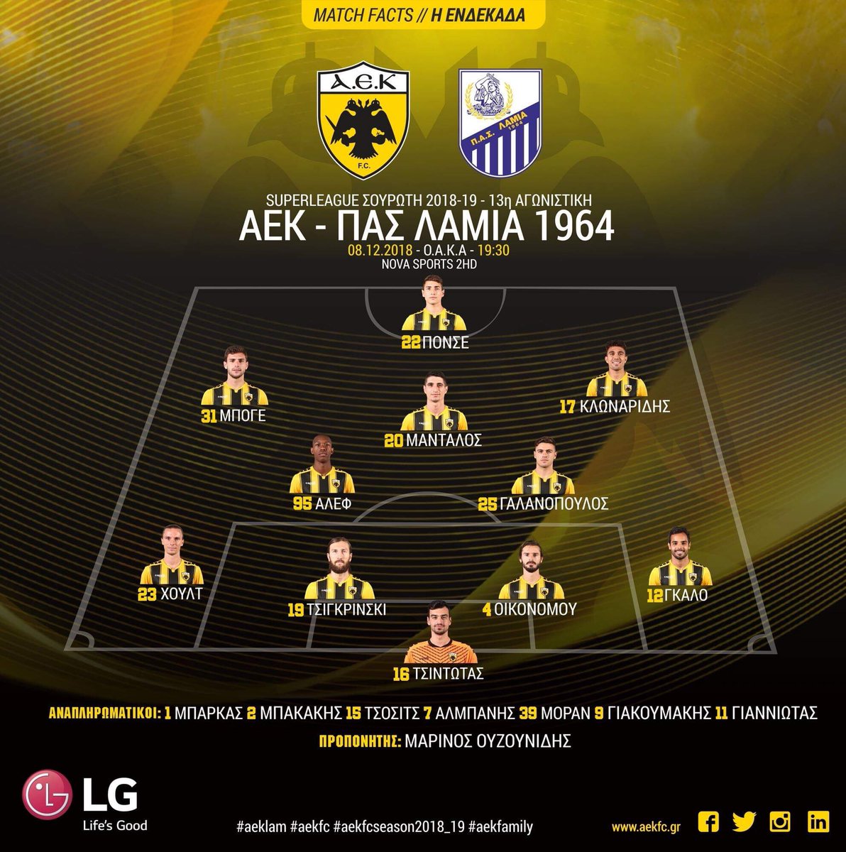 Η ενδεκάδα του Μαρίνου Ουζουνίδη για τον εντός έδρας αγώνα της ΑΕΚ με την Λαμία (19.30,